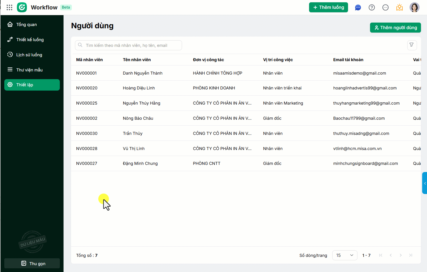 1. Trên ứng dụng AMIS Workflow, vào phân hệ Thiết lập, tại đây hiển thị danh sách người dùng đã thêm vào ứng dụng.