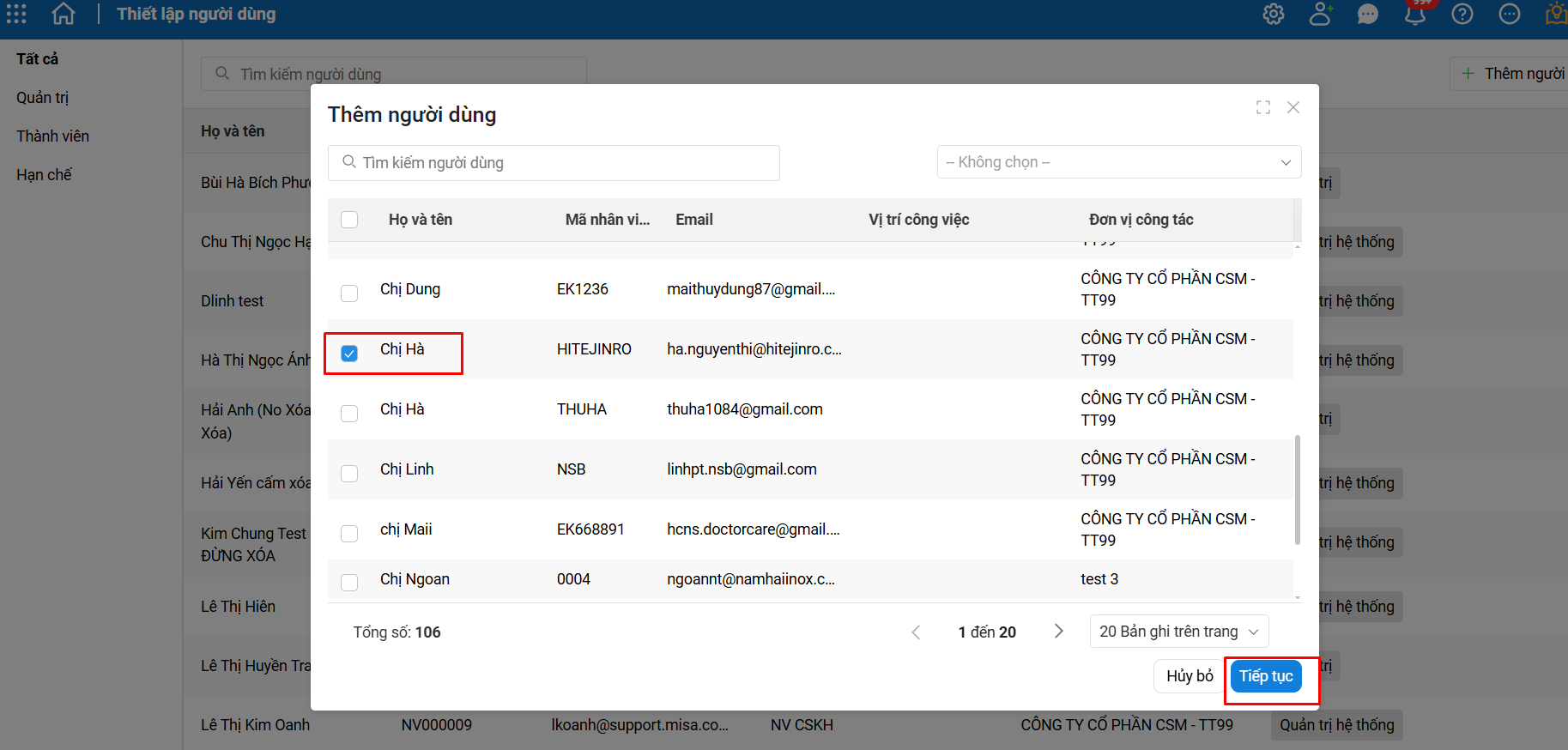 Bước 3: Tích chọn những người dùng muốn thêm\ Nhấn Tiếp tục.