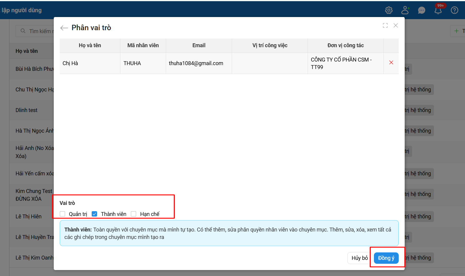 Bước 4: Chọn vai trò thích hợp cho người dùng\ Nhấn Đồng ý.