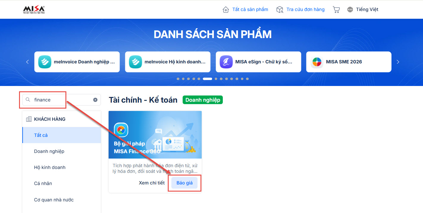 - Anh/chị truy cập MISA Store, tìm kiếm sản phẩm Bộ giải pháp Phần mềm MISA Finance 360 => nhấn Báo giá.