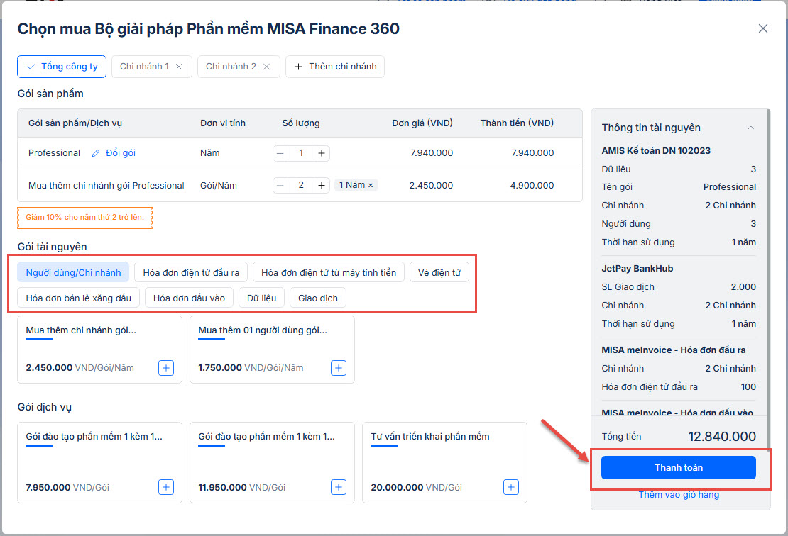 - Anh/chị có thể mua thêm Chi nhánh hoặc Gói tài nguyên, Gói dịch vụ khác (nếu cần).