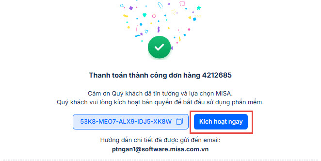 - Anh/chị nhấn Kích hoạt ngay trên màn hình thanh toán thành công (hoặc tin nhắn hướng dẫn kích hoạt được gửi tới email đặt hàng).