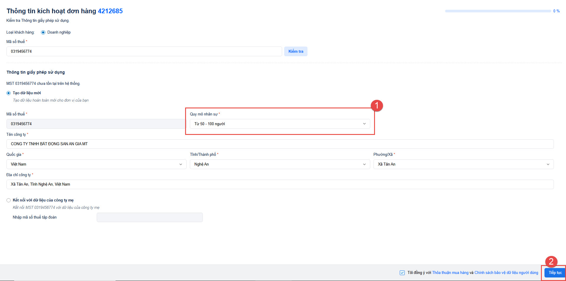 - Quy mô nhân sự => nhấn Tiếp tục.
