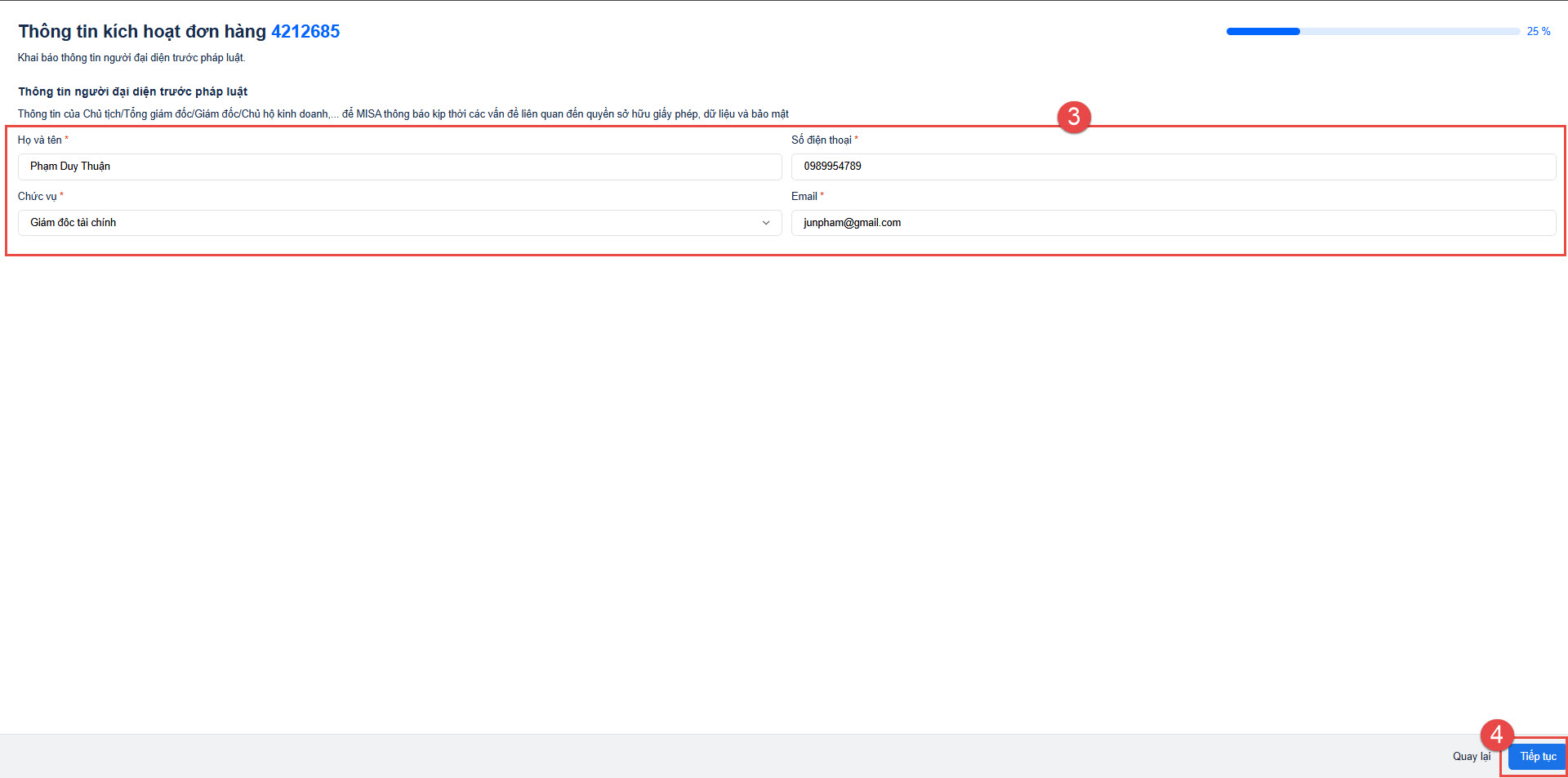 - Thông tin người đại diện trước pháp luật => nhấn Tiếp tục.