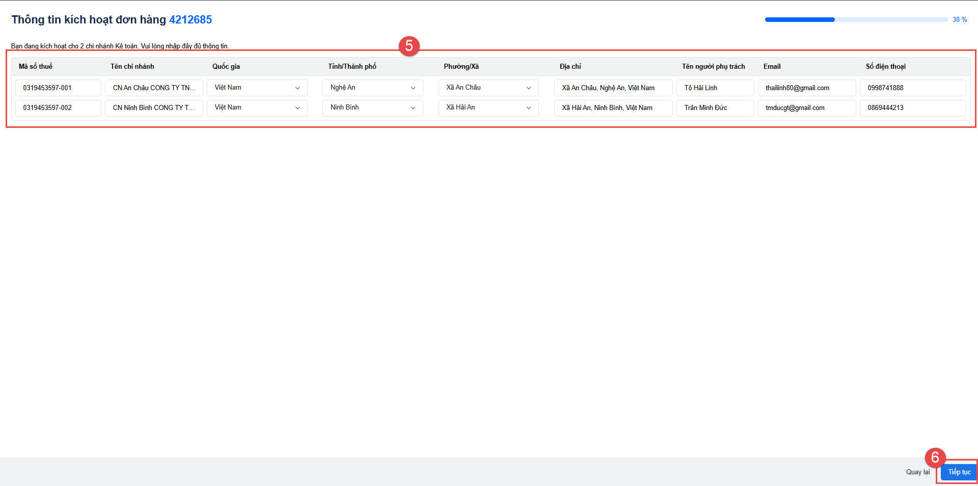 - Thông tin chi nhánh (nếu thêm chi nhánh) => nhấn Tiếp tục để kích hoạt phần mềm.