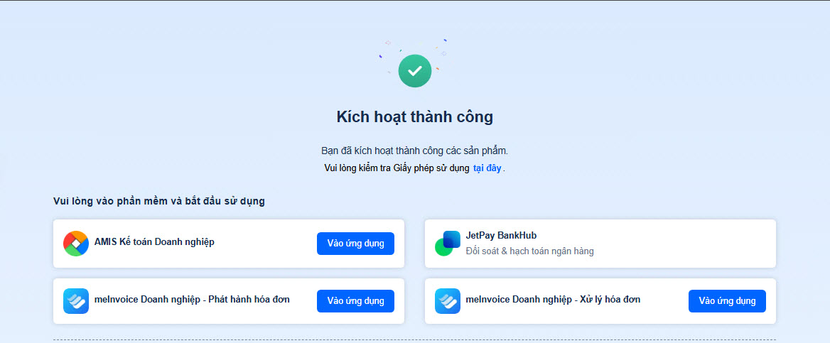 - Kích hoạt thành công, anh/chị Vào ứng dụng để bắt đầu sử dụng.