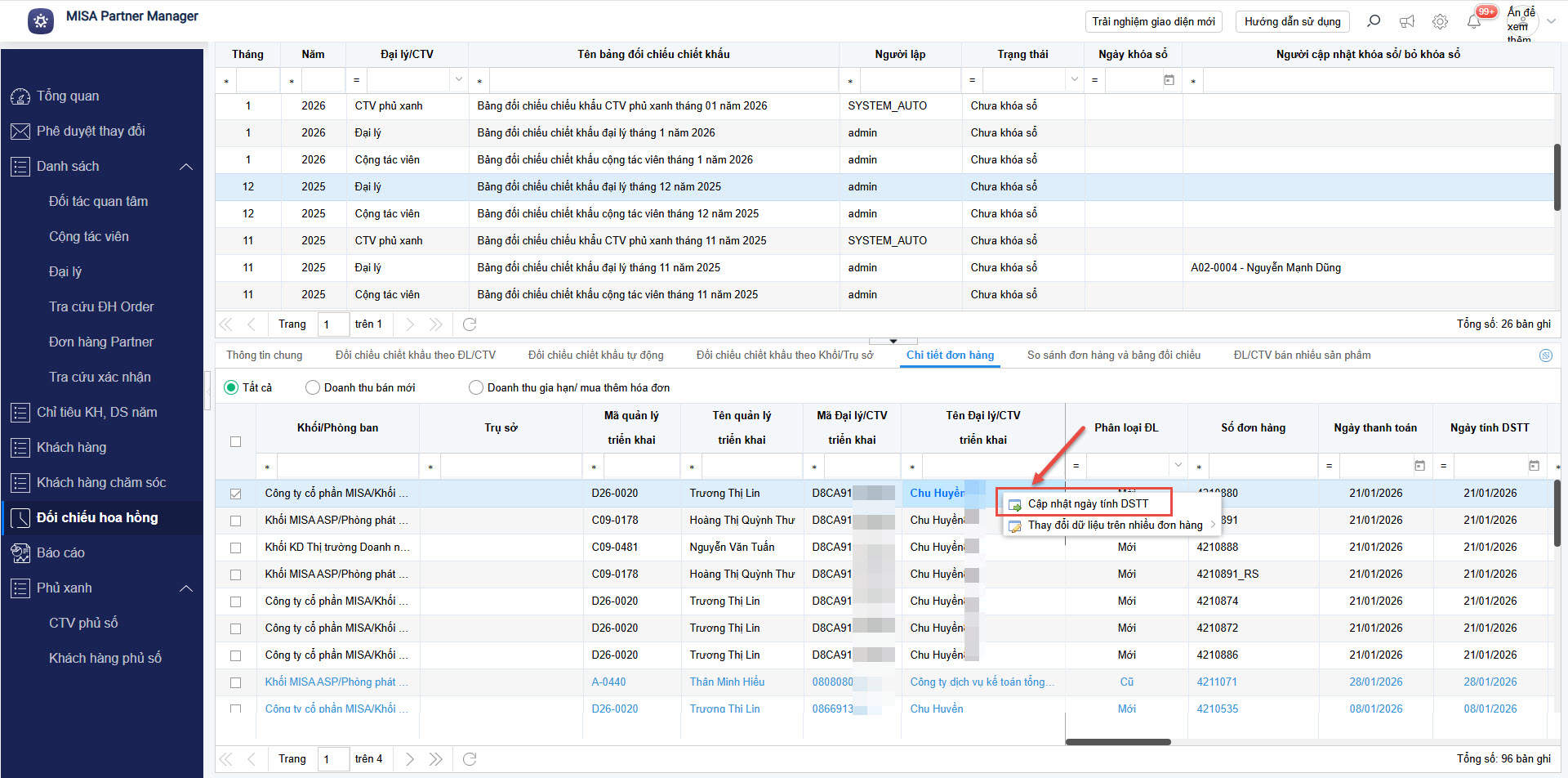 • Trường hợp cần cập nhật doanh số tính thưởng cho đơn hàng, anh/chị có thể truy cập phân hệ Đối chiếu hoa hồng hoặc Đơn hàng Partner để thực hiện.