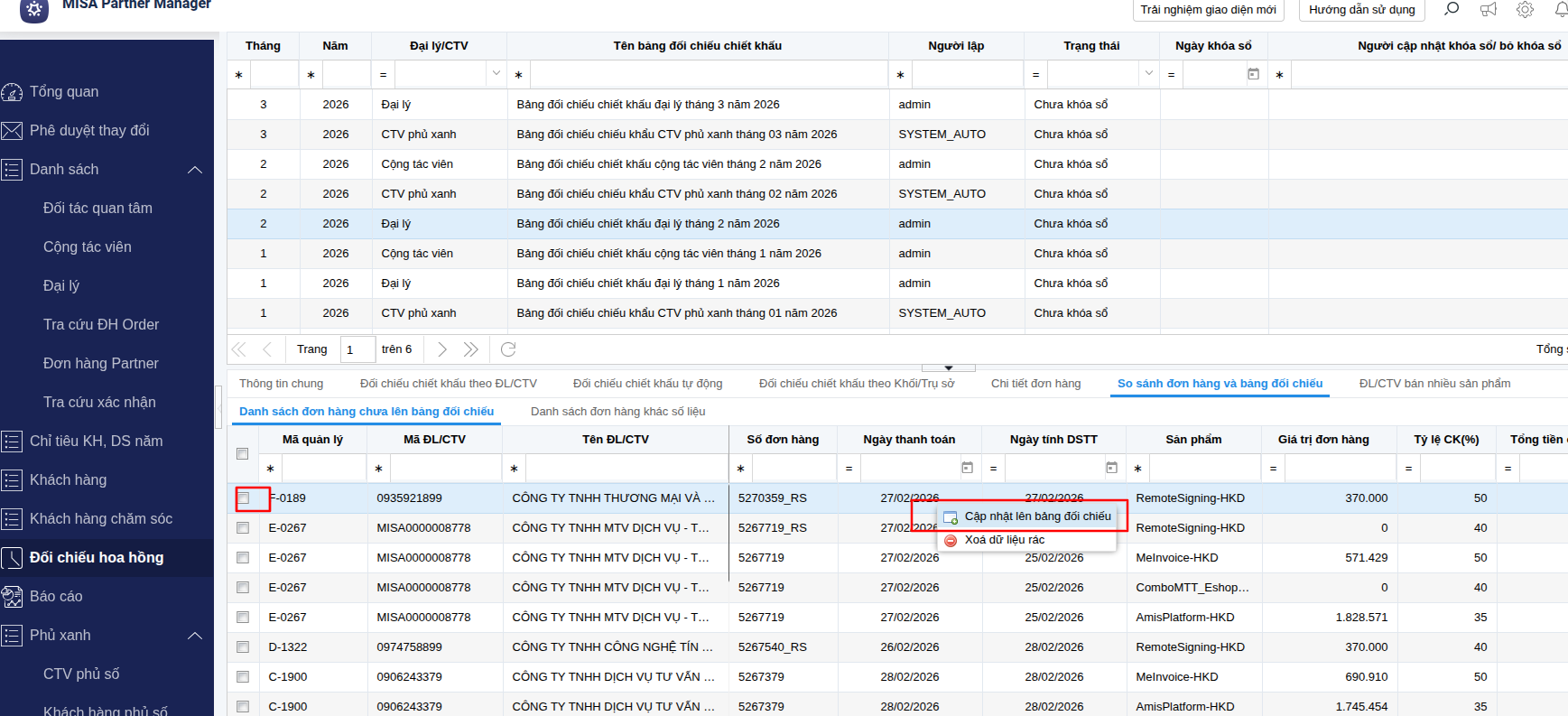 • Nhấn chuột phải vào đơn hàng => nhấn chọn Cập nhật lên bảng đối chiếu.