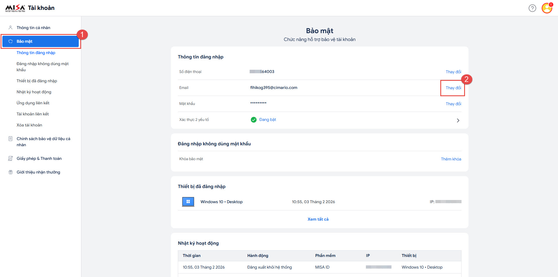 - Để thông tin tài khoản MISA ID của anh/chị luôn đầy đủ và đảm bảo tính bảo mật, trong trường hợp cần bổ sung hoặc thay đổi Email/SĐT, anh/chị vui lòng truy cập trực tiếp vào tài khoản MISA ID của mình để cập nhật.