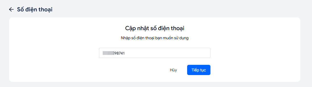 - Sau đó, nhập SĐT mới => nhấn Tiếp tục.