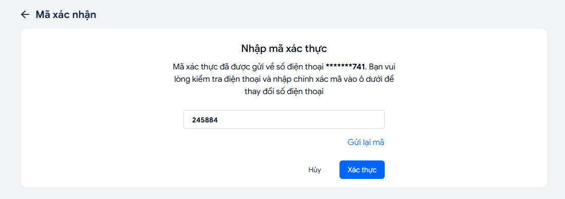 - Truy cập Zalo/SMS mới lấy mã xác thực => nhập vào ô xác thực => nhấn Xác thực.