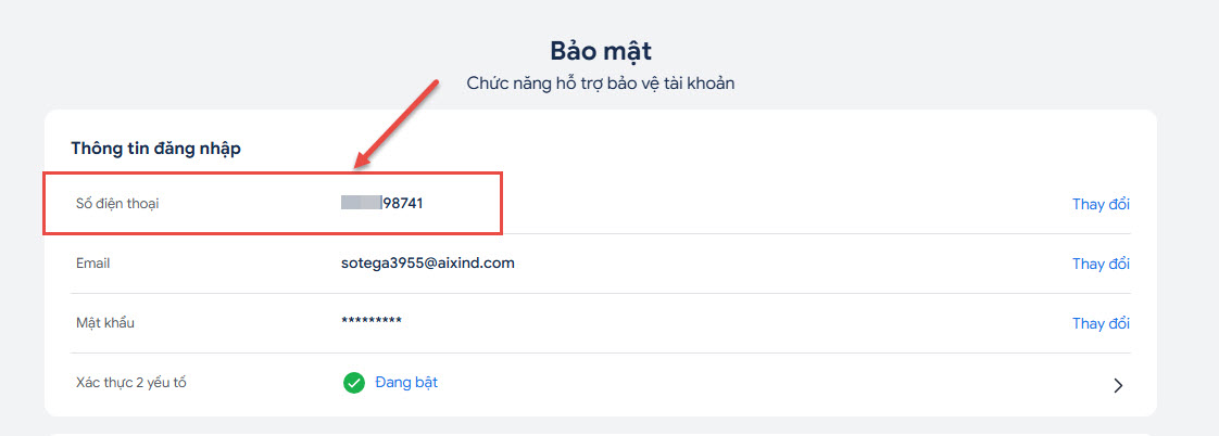 - Trên phân hệ Thông tin đăng nhập/Số điện thoại => anh/chị nhấn Thay đổi.