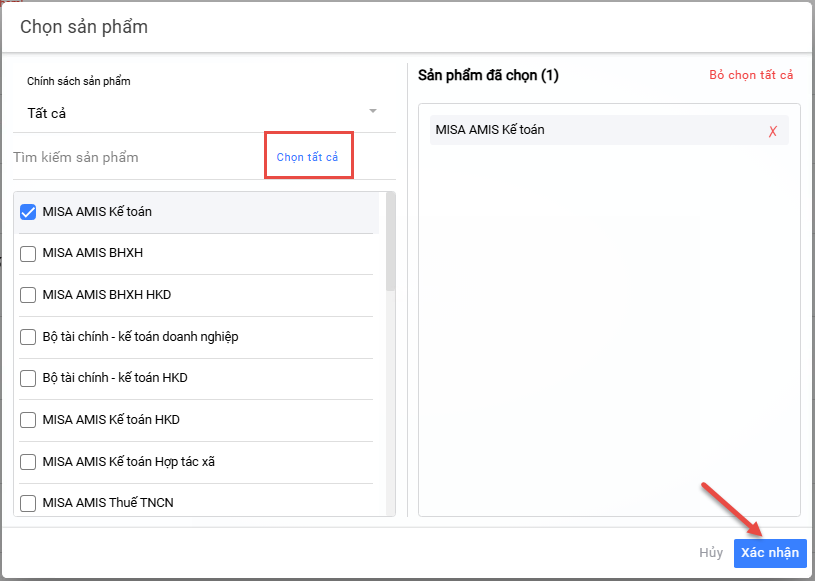- Sản phẩm: có thể chọn một hoặc tất cả sản phẩm rồi nhấn Xác nhận.