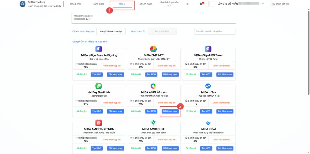 - Anh/chị truy cập phân hệ Đại lý, chọn sản phẩm cần mua đã khai báo ở trên rồi nhấn Đặt hàng ngay.