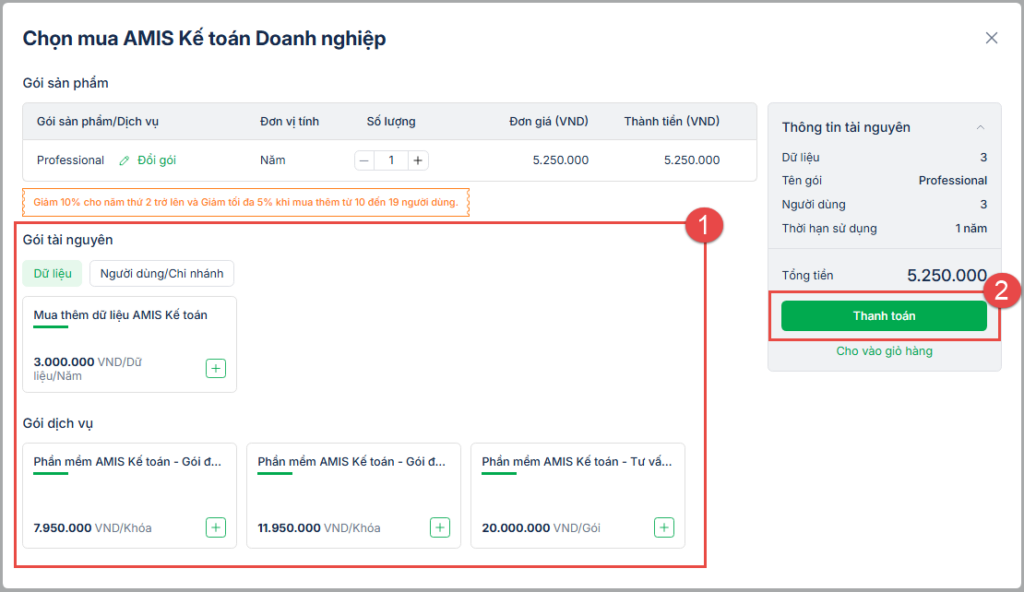 - Tại đây, có thể chọn thêm gói tài nguyên để mua kèm với gói sản phẩm rồi nhấn Thanh toán.