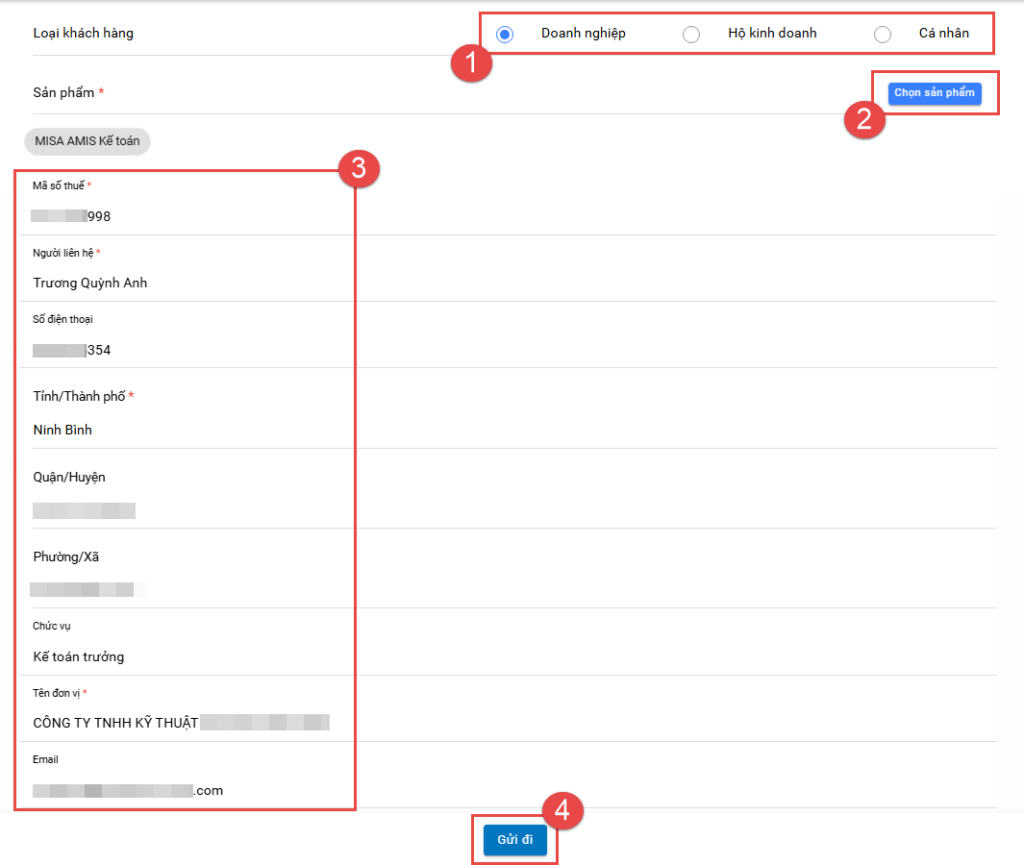 - Anh/chị nhập đầy đủ các thông tin cần thiết rồi nhấn Gửi đi là khai báo khách hàng thành công: