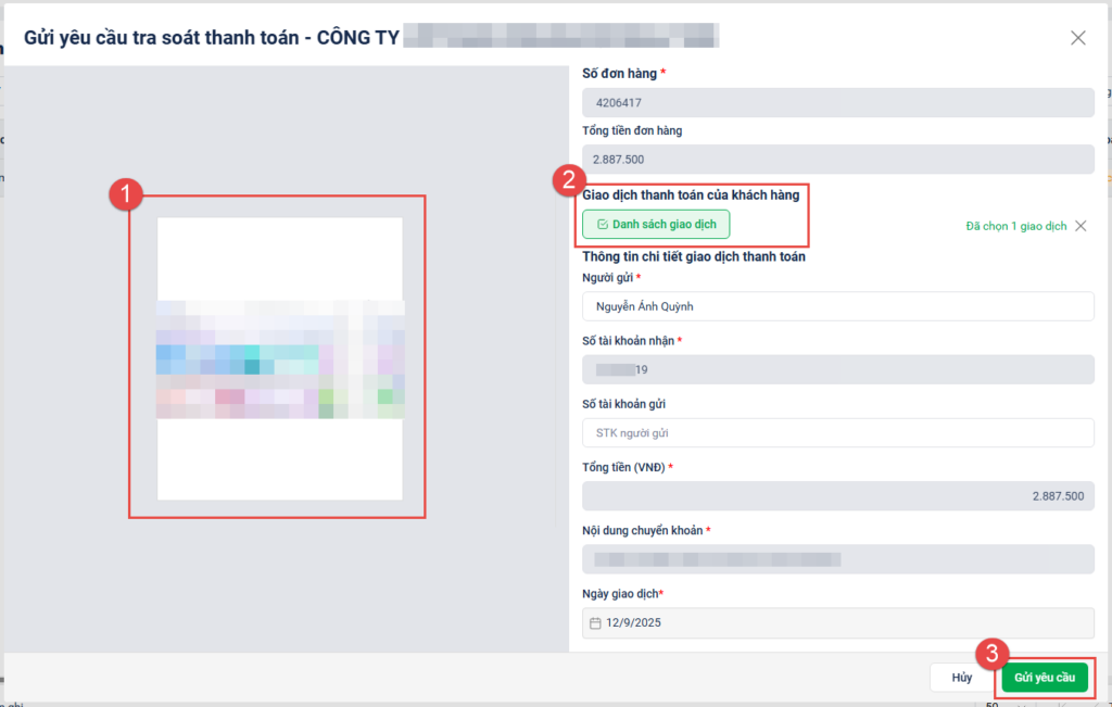 - Tại đây, NVKD cập nhật ảnh giao dịch, chọn giao dịch rồi nhấn Gửi yêu cầu để hoàn tất.
