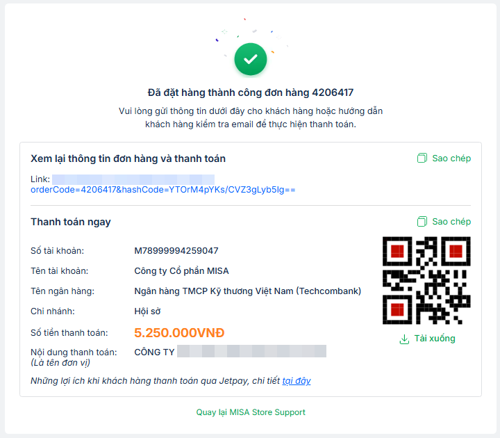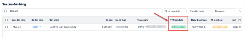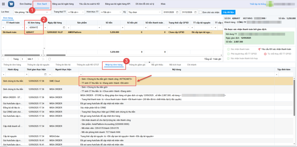 - Sau khi gửi yêu cầu tra soát thành công, đơn hàng sẽ được cập nhật sang trạng thái Đã thanh toán và đồng bộ trạng thái này sang Order để sinh phiếu thu cho khách hàng trên AMIS Kế toán, trong đó mỗi dòng chi tiết sẽ được tách theo từng đơn hàng với giá trị tương ứng của từng đơn. Đồng thời, khách hàng sẽ nhận được email thông báo xác nhận thanh toán thành công đơn hàng.