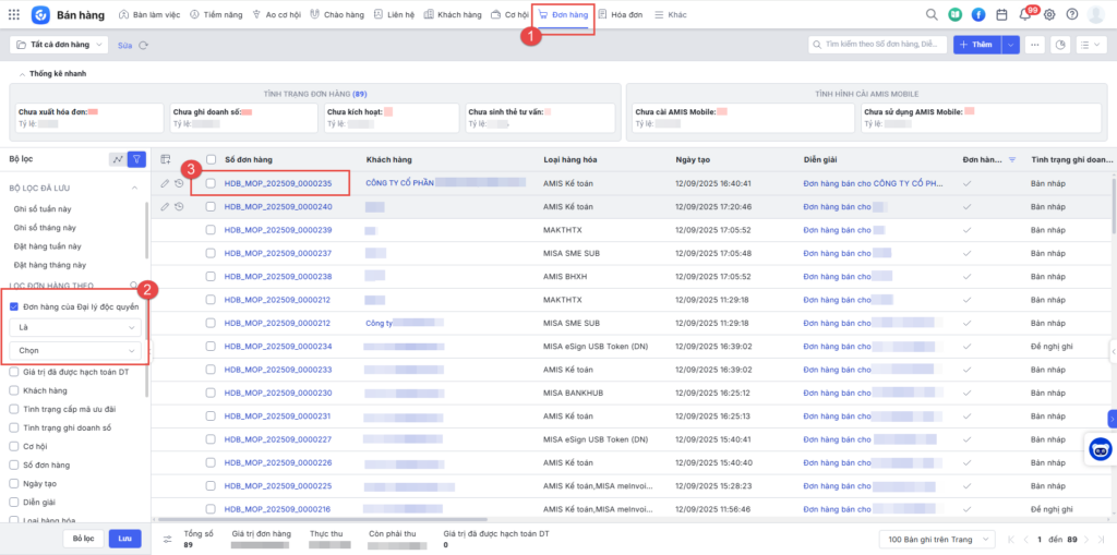 - Để thực hiện đề nghị ghi doanh số và xuất hóa đơn cho các đơn hàng của ĐLĐQ đã thực hiện ở trên, NVKD vui lòng truy cập CRM/Đơn hàng.
