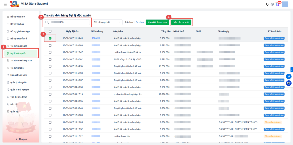 - Cuối tháng, sau khi các ĐLĐQ thanh toán tiền cho MISA, để lập yêu cầu tra soát cho các đơn hàng đã thanh toán, NVKD sẽ truy cập MISA Store Support/Đại lý độc quyền, nhập số đơn hàng rồi nhấn Yêu cầu tra soát.
