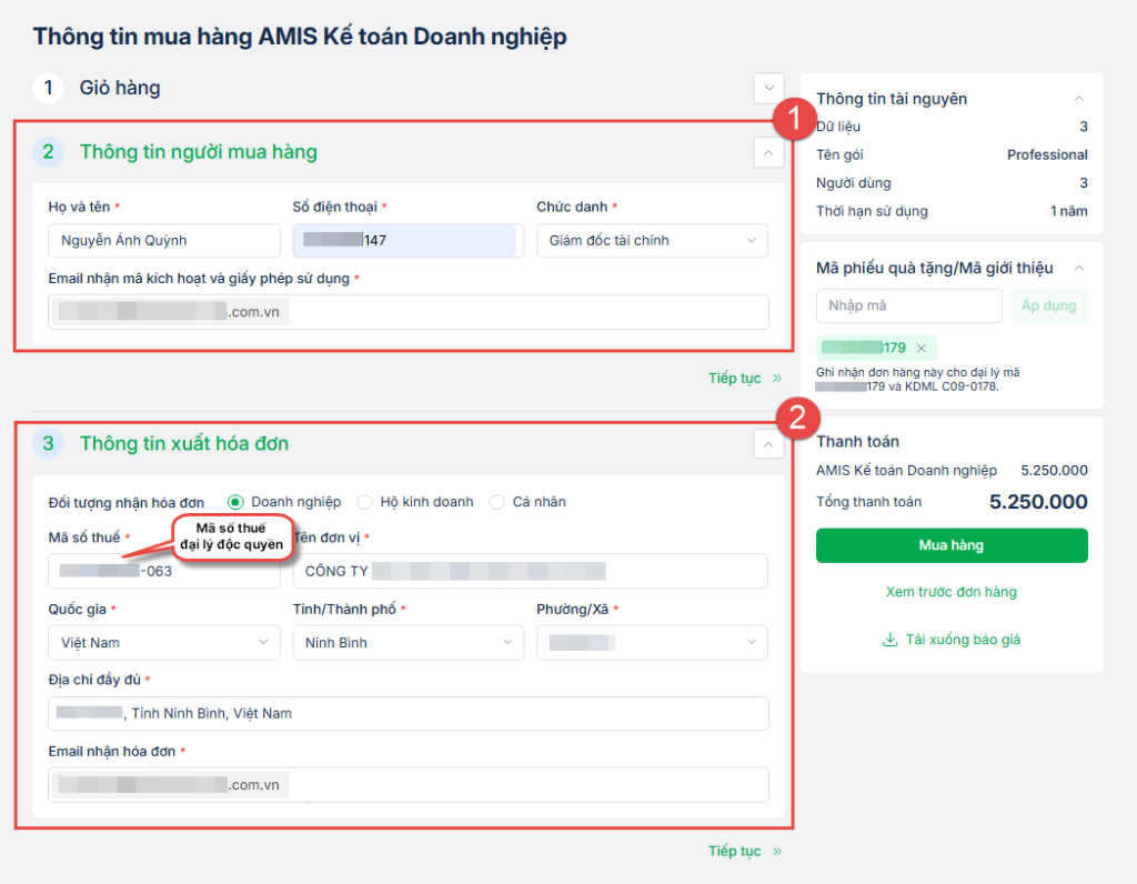 - Thông tin xuất hóa đơn: lưu ý, nhập đúng mã số thuế đã được ghi nhận theo đại lý độc quyền để đảm bảo nếu đặt hàng cho khách hàng này thì đơn hàng đó sẽ được ghi nhận cho đại lý độc quyền.