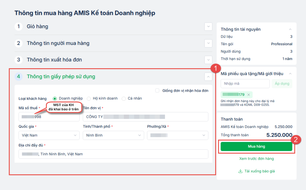 - Thông tin giấy phép sử dụng: điền đúng thông tin khách hàng như đã khai báo ở trên.