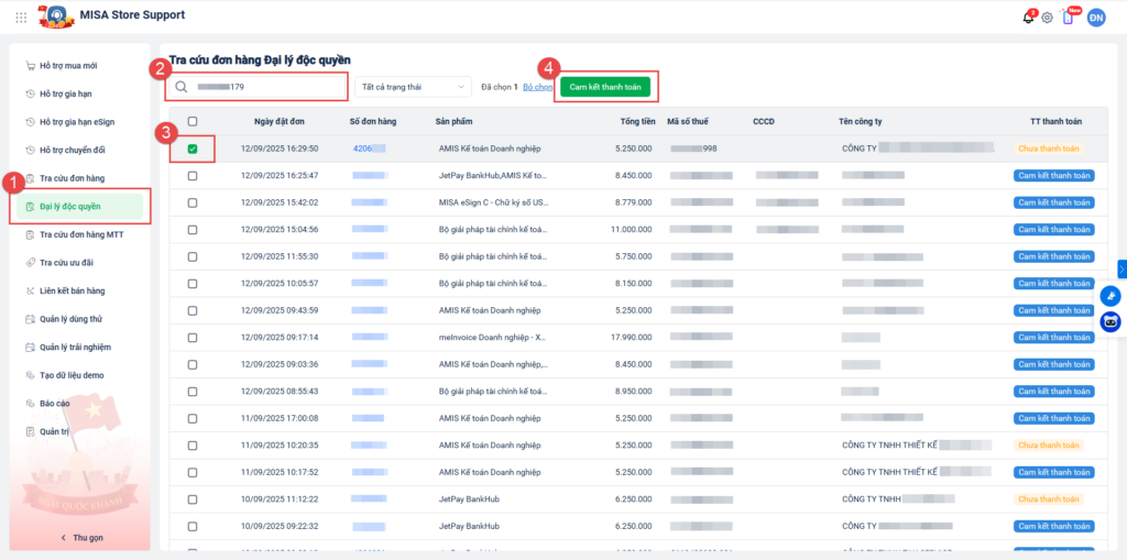 - Sau khi Đại lý độc quyền đặt hàng thành công, để cấp tài nguyên cho KH sử dụng phần mềm, NVKD cần đăng nhập Store Support/Đại lý độc quyền, thực hiện tra cứu đơn hàng bằng mã đại lý/cộng tác viên (CTV). Sau đó, tích chọn các đơn hàng cần cam kết thanh toán và nhấn Cam kết thanh toán.