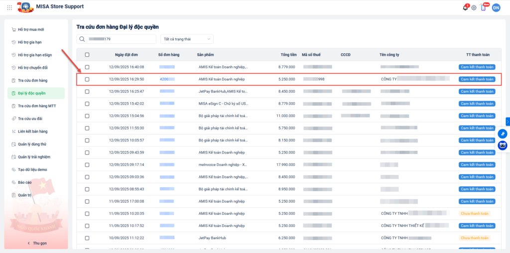 - Đơn hàng được đánh dấu là đơn hàng đại lý độc quyền thì mới được xác nhận cam kết thanh toán cho đơn hàng tại MISA Store Support.