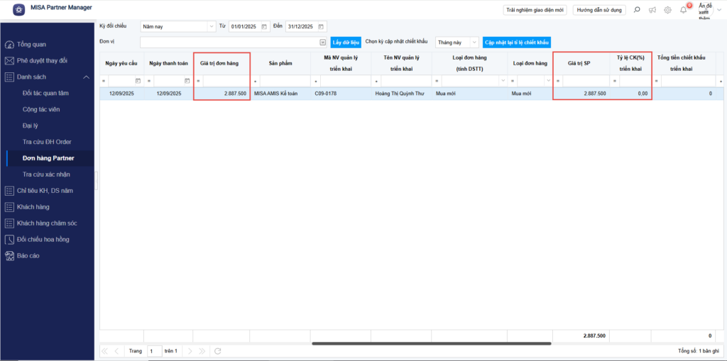 - Trên MISA Partner Manager/Đơn hàng Partner, đơn hàng cũng sẽ hiển thị thông tin Giá trị đơn hàng, Giá trị SP là giá sau chiết khấu và Tỷ lệ chiết khấu sẽ hiển thị bằng 0.