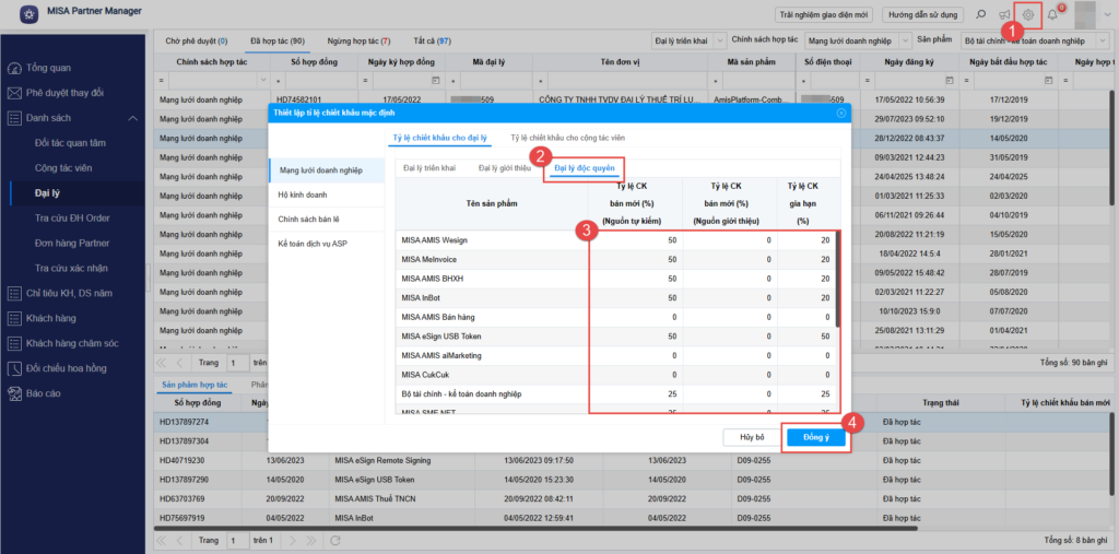 - Chọn vào thiết lập, nhấn xem tỷ lệ chiết khấu của Đại lý độc quyền. Tại đây, có thể chỉnh sửa tỷ lệ chiết khấu (nếu cần) sau đó nhấn Đồng ý.