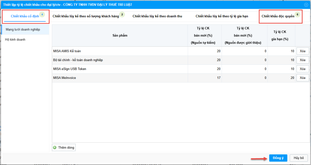 - Tại đây, NVKD có thể kiểm tra và sửa tỷ lệ chiết khấu cố định, tỷ lệ chiết khấu độc quyền.