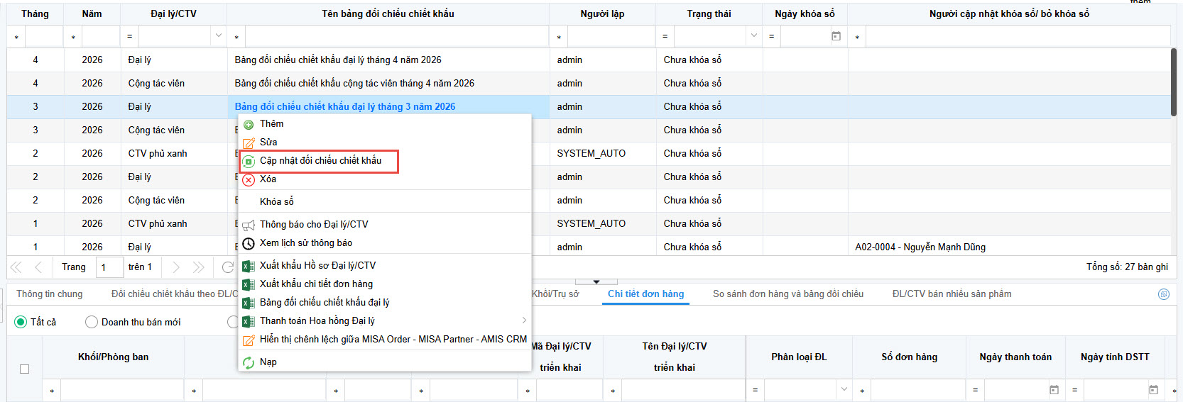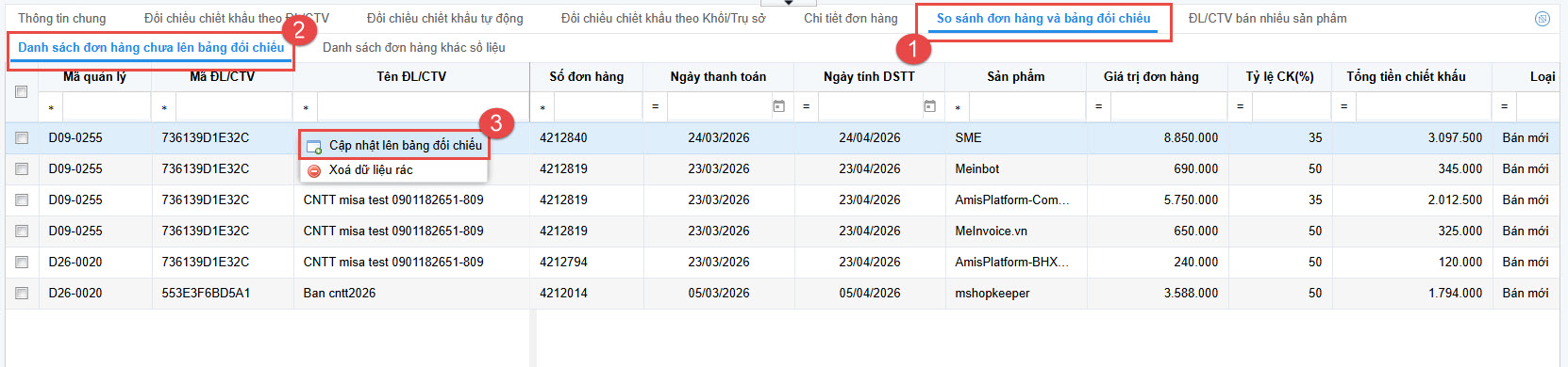 - Tìm kiếm đơn hàng => click chuột phải tại dòng đơn hàng => nhấn Cập nhật lên bảng đối chiếu.