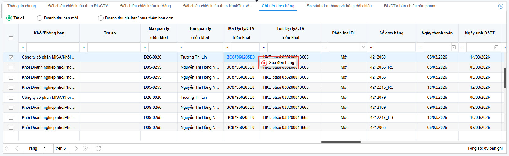 - Anh/chị truy cập phân hệ Đối chiếu hoa hồng, tab Chi tiết đơn hàng để xem danh sách các đơn hàng thỏa mãn điều kiện của kì đối chiếu.