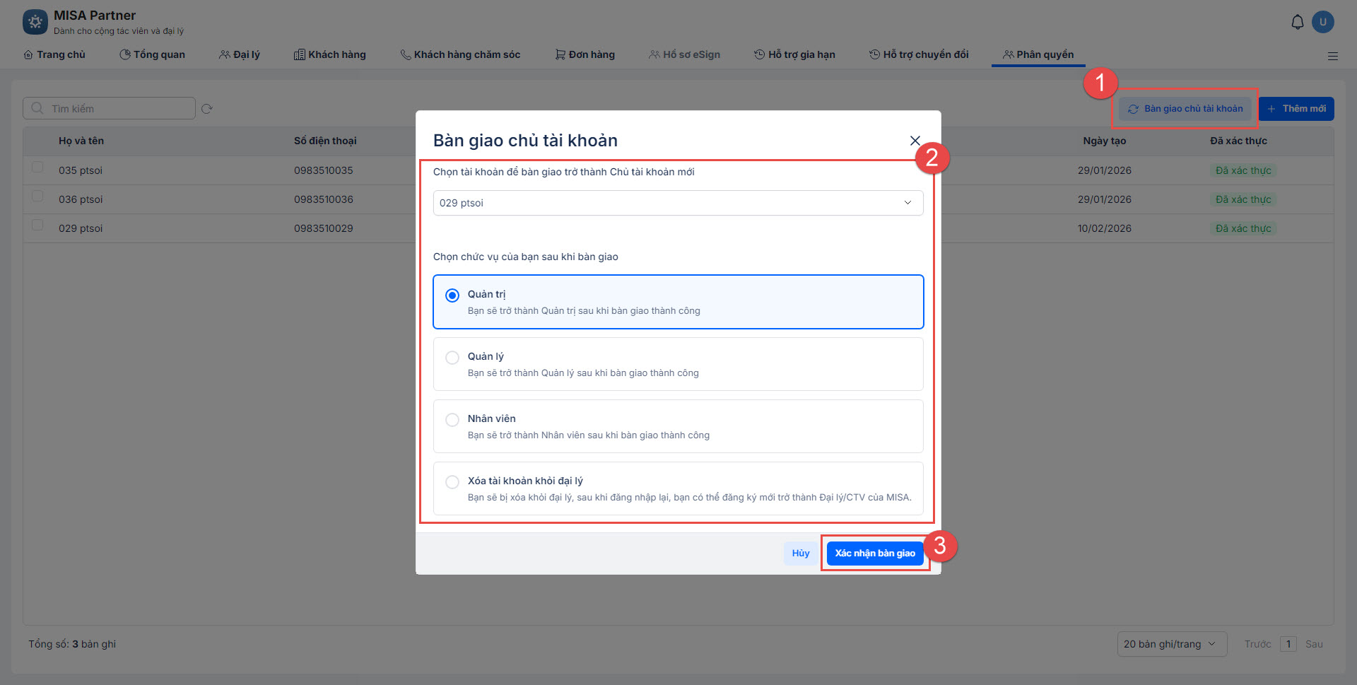 - Bàn giao thành công, anh/chị sẽ bị đăng xuất khỏi tài khoản chủ đại lý và chỉ có thể đăng nhập với chức vụ đã chọn sau khi bàn giao ở trên.