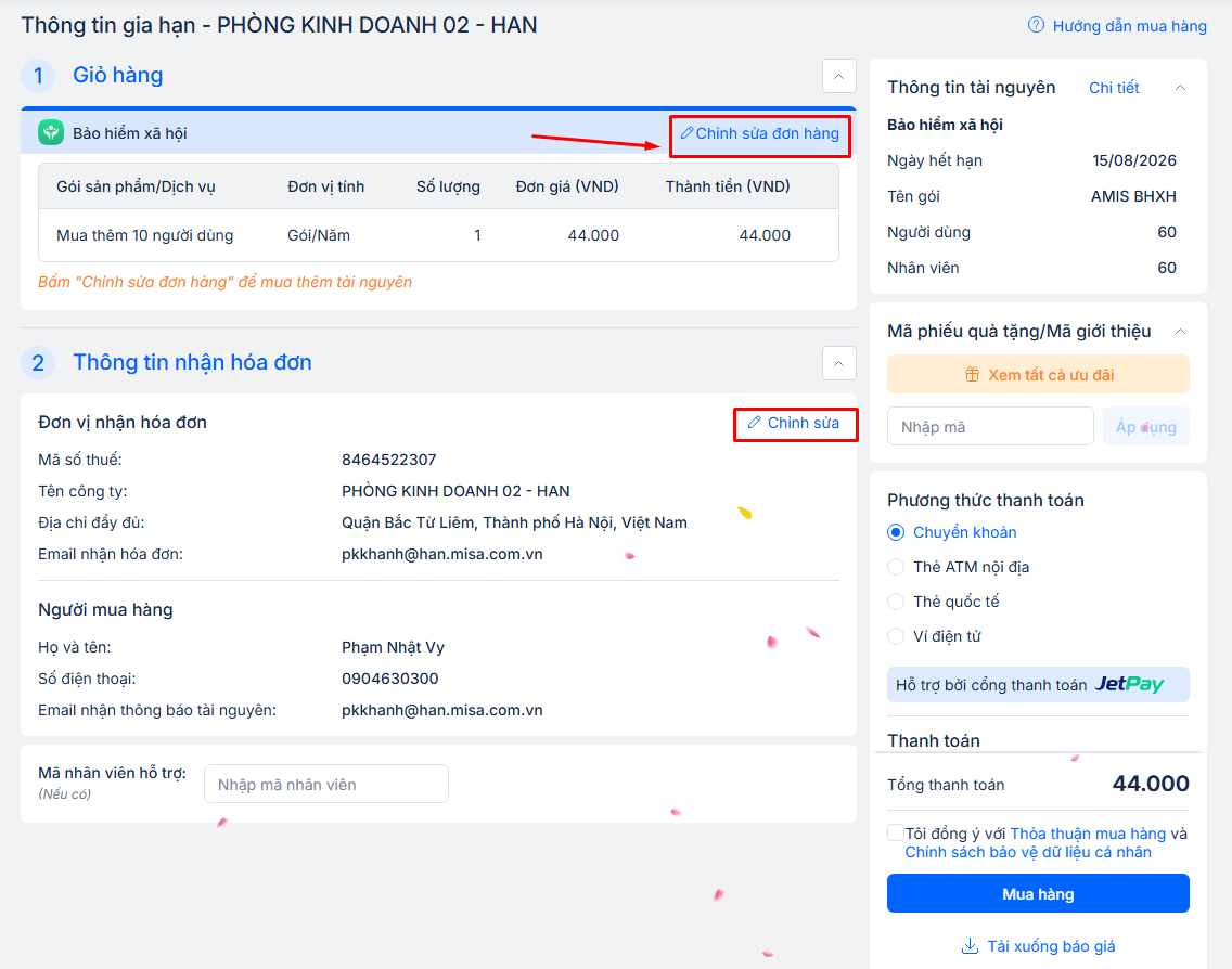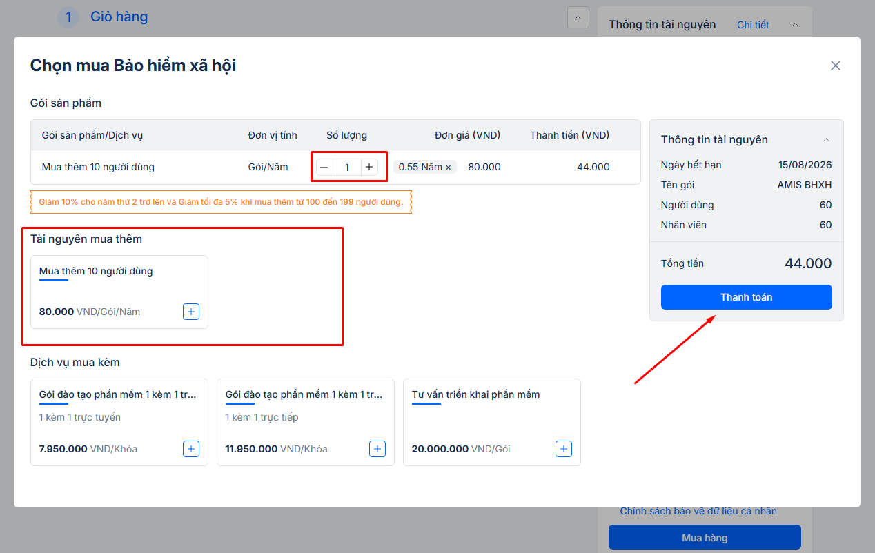 3. Hướng dẫn mua thêm tài nguyên AMIS Bảo hiểm xã hội