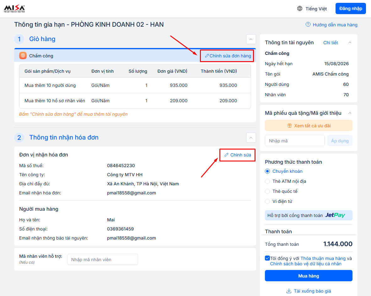 3. Hướng dẫn thực hiện mua thêm tài nguyên AMIS Chấm công