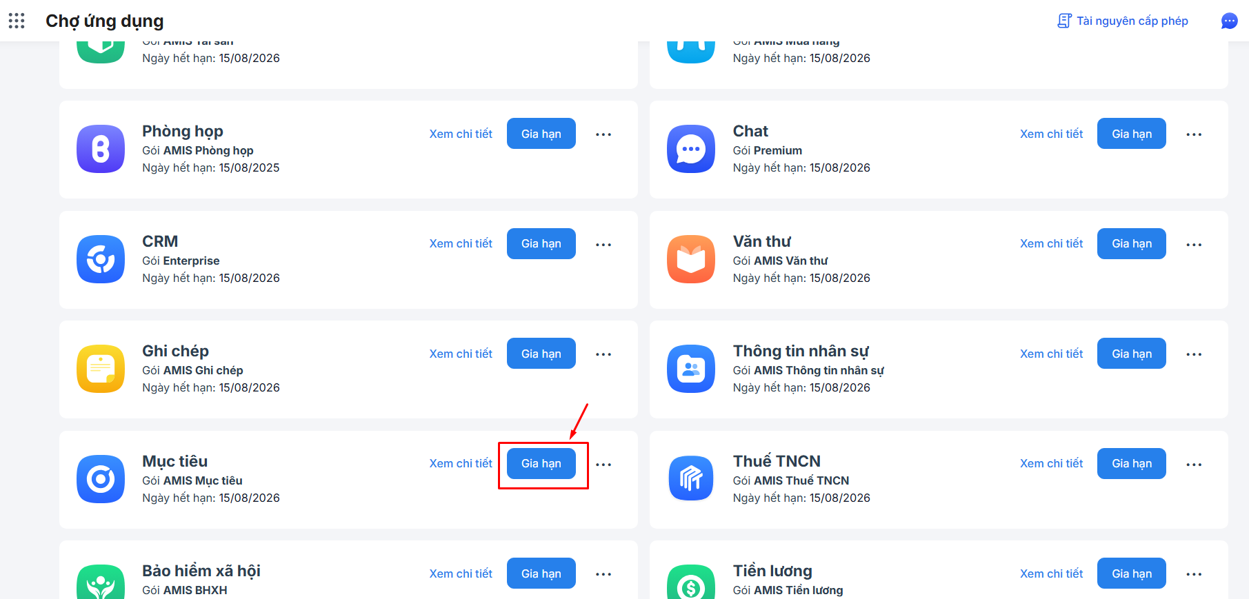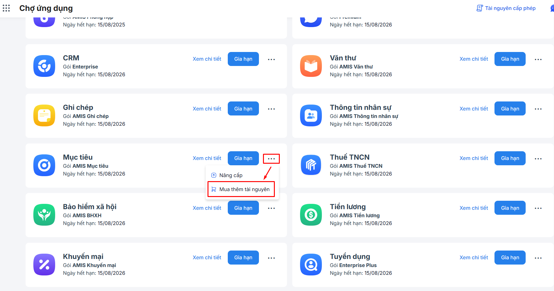 Bước 2: Tại chợ ứng dụng\ Tìm AMIS Mục tiêu\ Nhấn vào biểu tượng dấu ba chấm cuối ứng dụng\ Chọn Mua thêm tài nguyên.