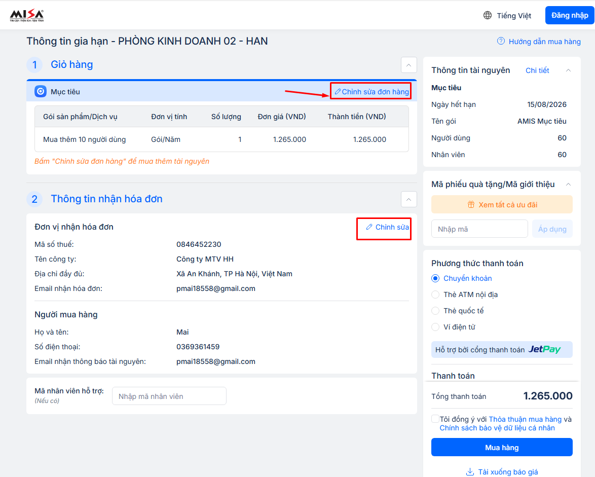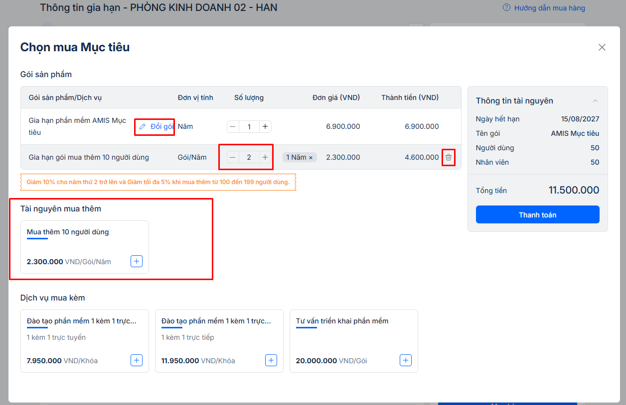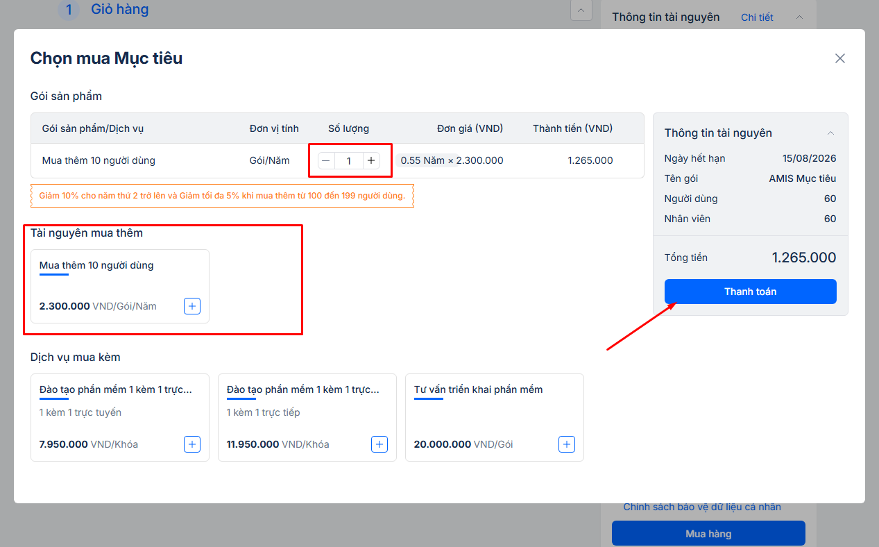 2. Hướng dẫn mua thêm tài nguyên AMIS Mục tiêu