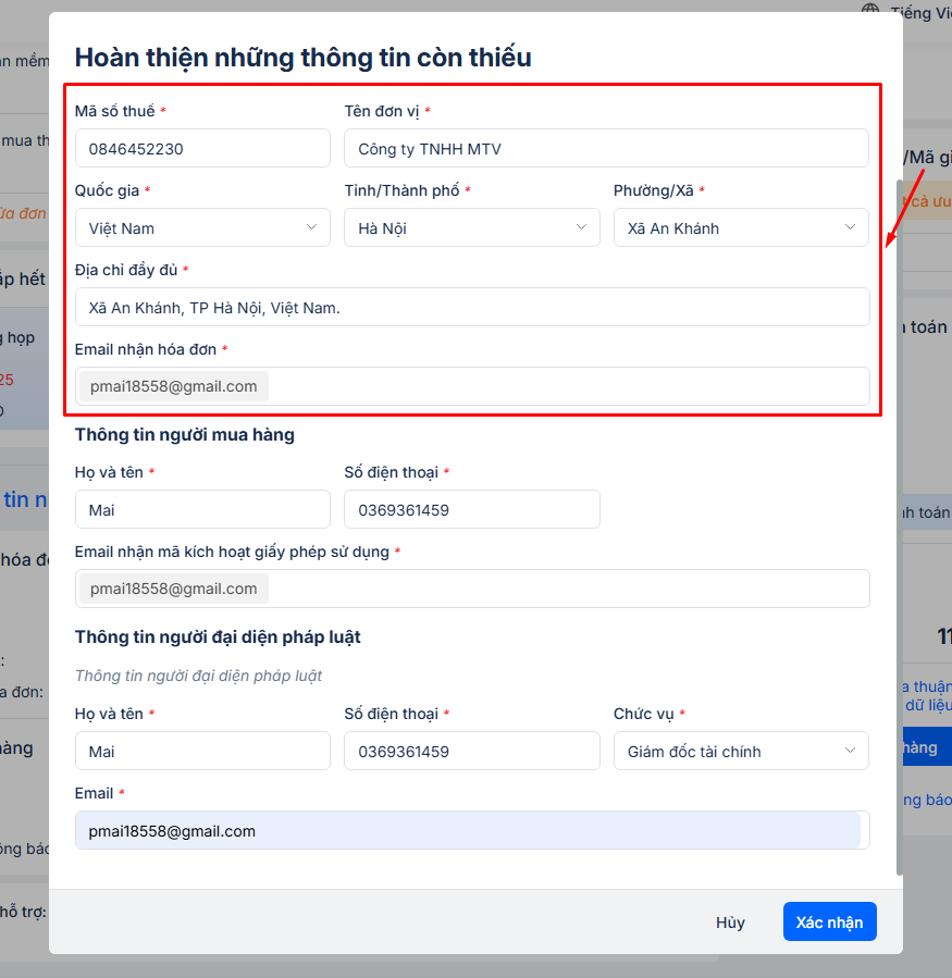 - Sau khi thanh toán thành công theo thông tin đơn hàng đã gửi về mail, hệ thống sẽ tự động cấp tài nguyên và xuất hóa đơn về địa chỉ mail đã điền\ Người dùng có thể quay lại phần mềm và truy cập Tiện ích/Giấy phép sử dụng để kiểm tra thông tin tài nguyên được cấp.