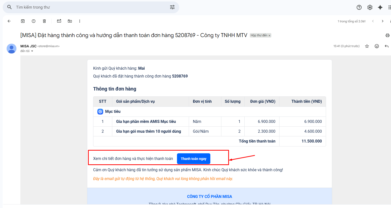 - Ngoài ra, khi đặt hàng thành công, MISA sẽ gửi “email thông tin đơn hàng” vào địa chỉ email đã khai báo (chính là địa chỉ email khai báo ở giao diện “Thông tin nhận hóa đơn”). Nhấn Thanh toán ngay để thực hiện thanh toán.