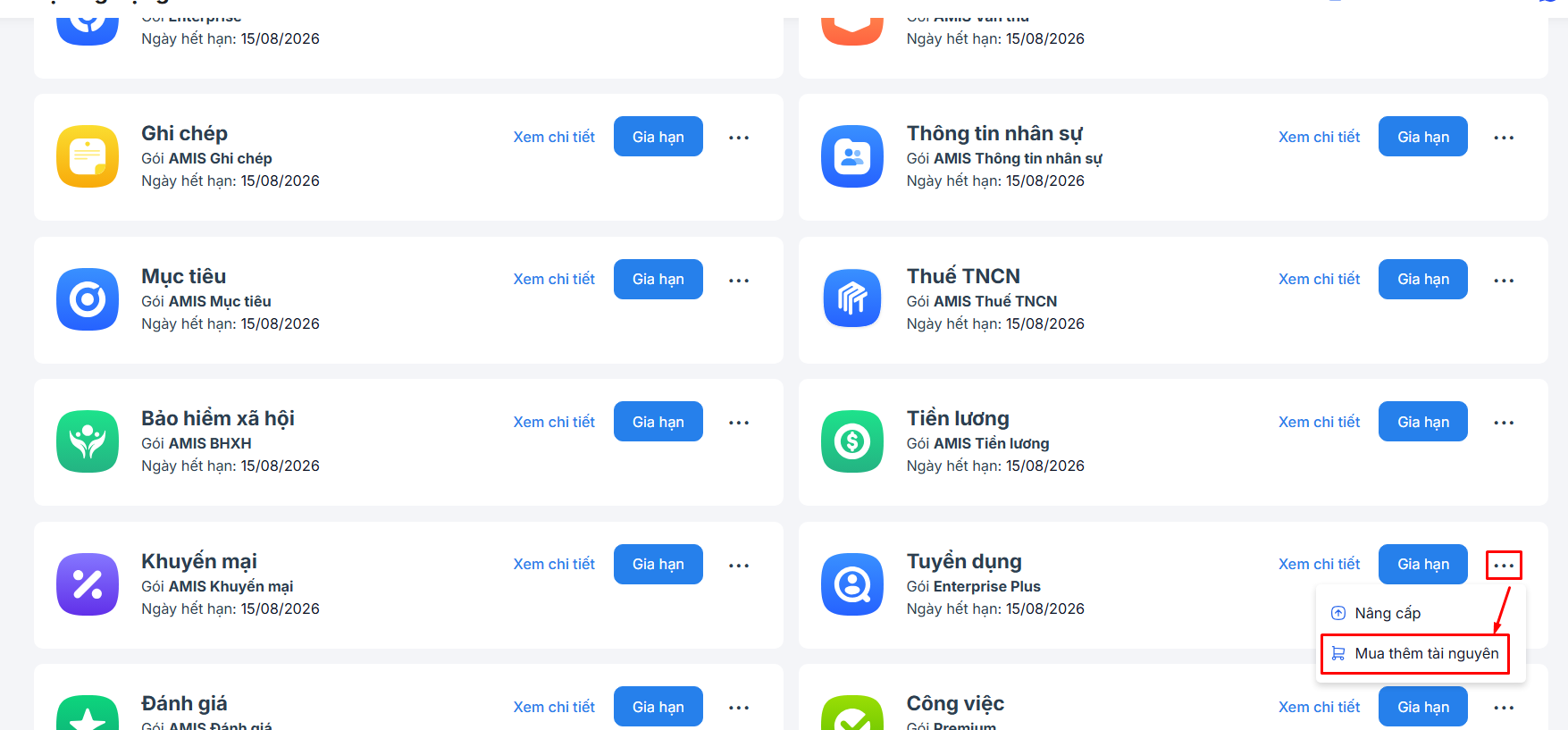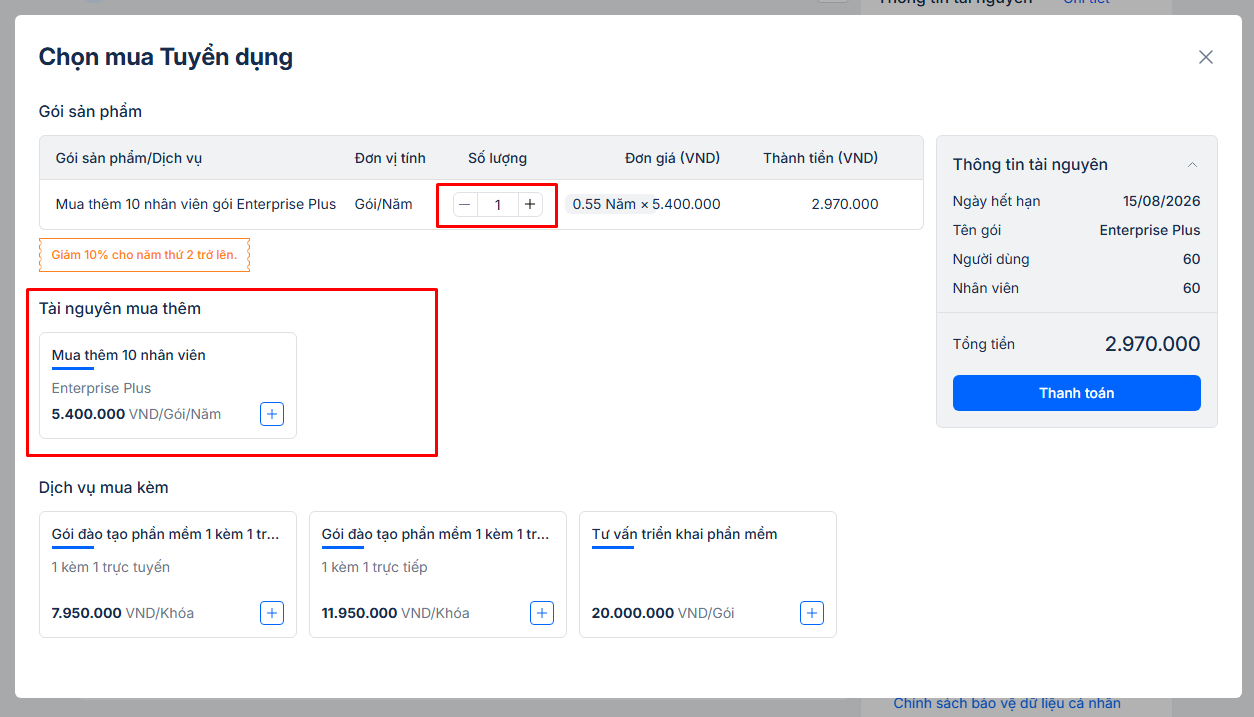 3. Hướng dẫn mua thêm tài nguyên AMIS Tuyển dụng