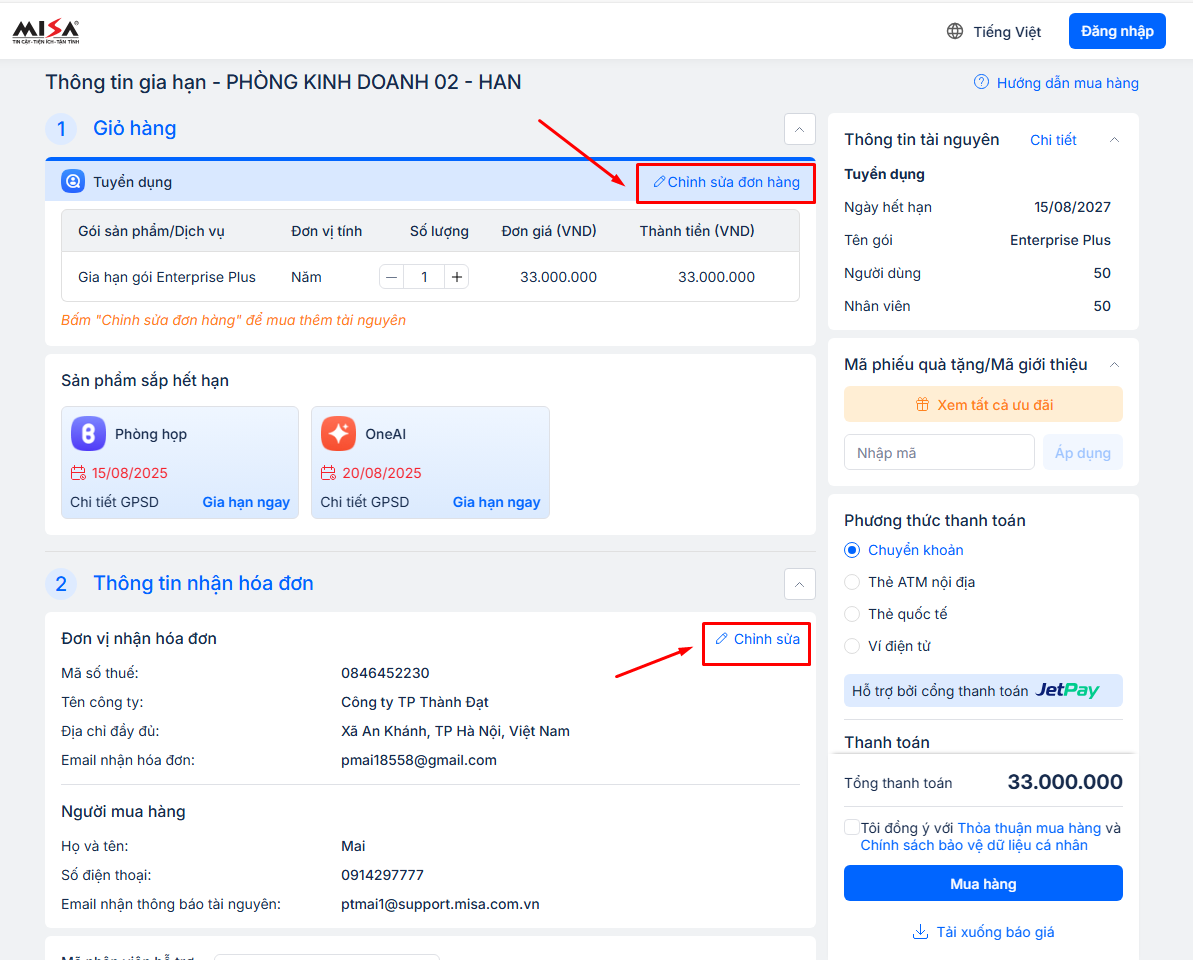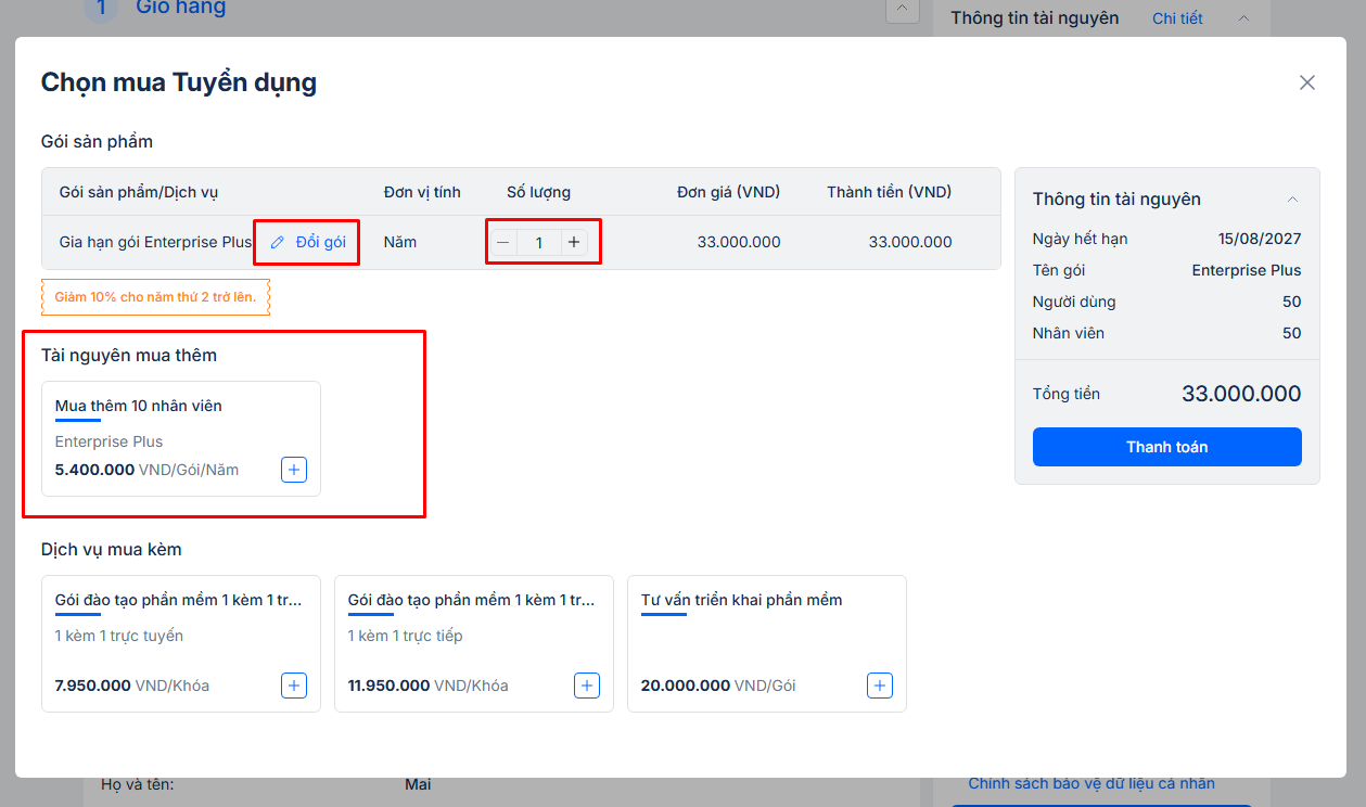 Bước 3: Phần mềm tự động lấy lên giỏ hàng gói 10 nhân viên mua thêm tối thiểu theo loại gói thuê bao đang sử dụng\ Nhấn chỉnh sửa để chọn lại tài nguyên mua thêm.