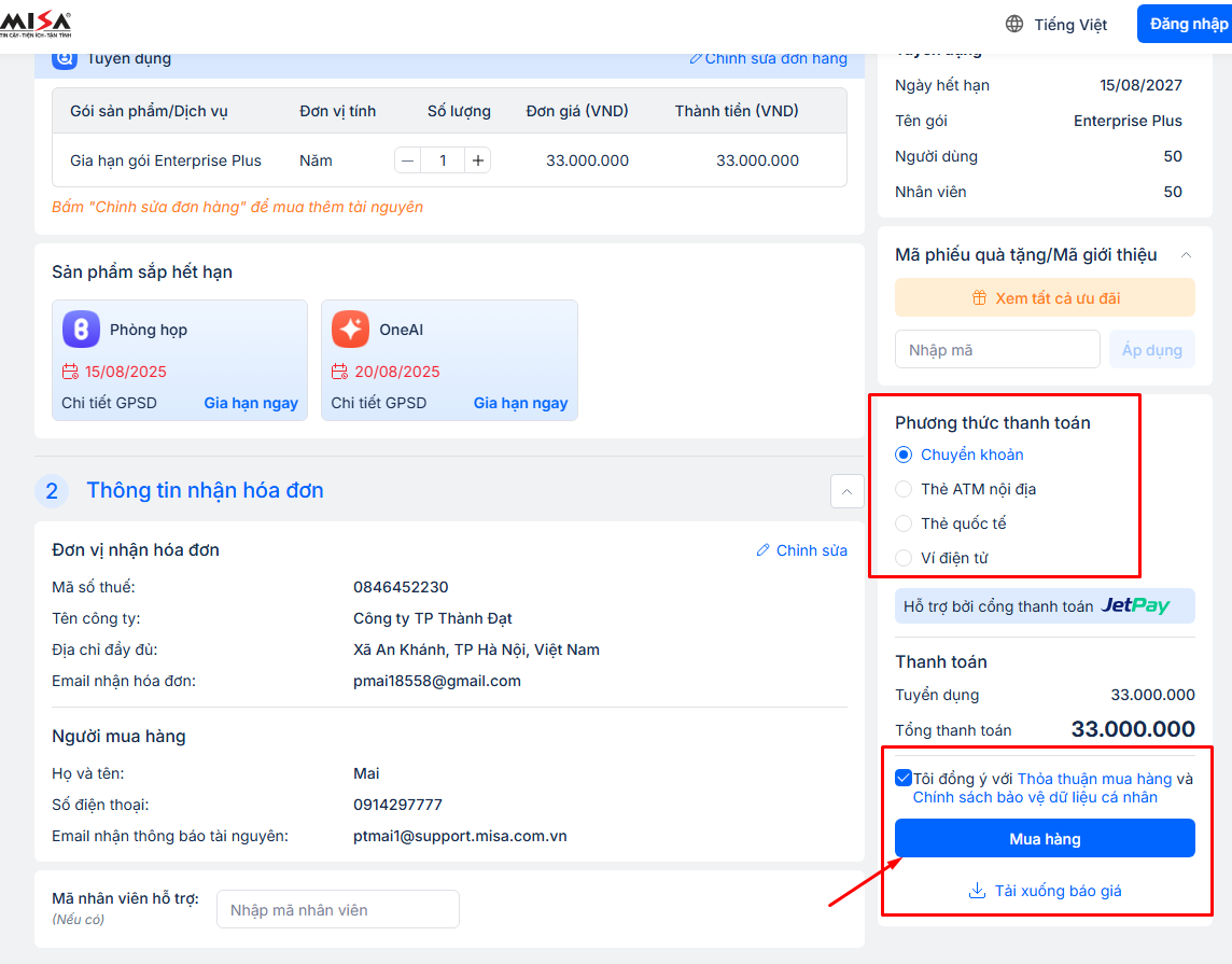 Bước 5: Tiến hành đặt hàng và thanh toán tương tự như thực hiện gia hạn ở phần 2.