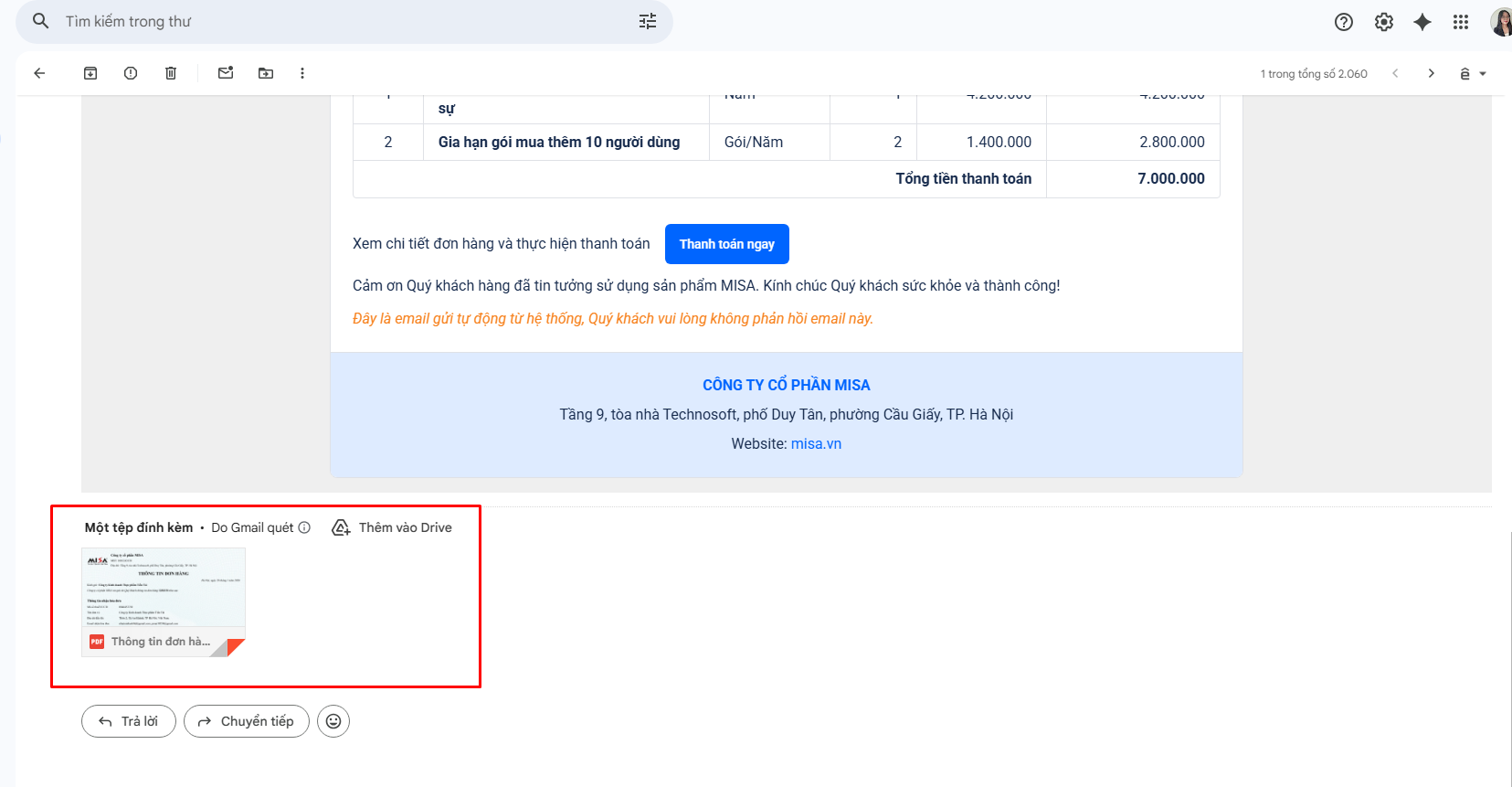 - Ngoài ra, khi đặt hàng thành công, MISA sẽ gửi “email thông tin đơn hàng” vào địa chỉ email đã khai báo (chính là địa chỉ email khai báo ở giao diện “Thông tin nhận hóa đơn”). Nhấn Thanh toán ngay để thực hiện thanh toán.