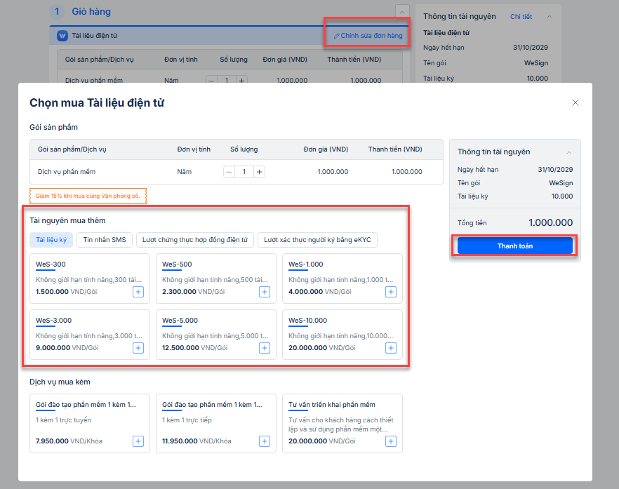 Bước 3: Để chỉnh sửa thông tin mua thêm, Anh\Chị bấm vào Chỉnh sửa đơn hàng, chọn Tài nguyên mua thêm theo nhu cầu.\ Bấm Thanh toán