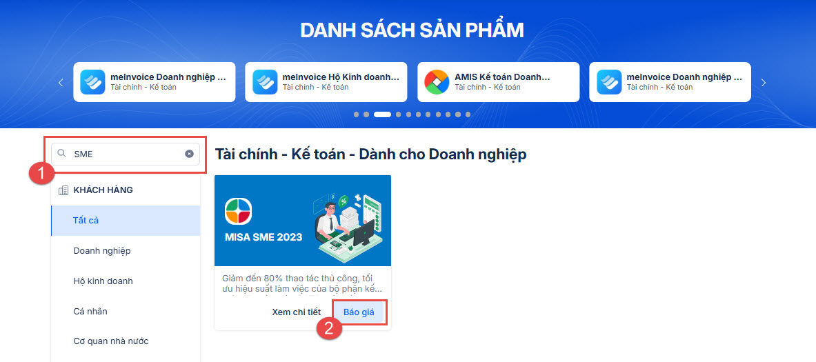 • Tại màn hình danh sách các sản phẩm, khách hàng tìm kiếm sản phấm MISA SME 2023 và nhấn vào Báo giá.