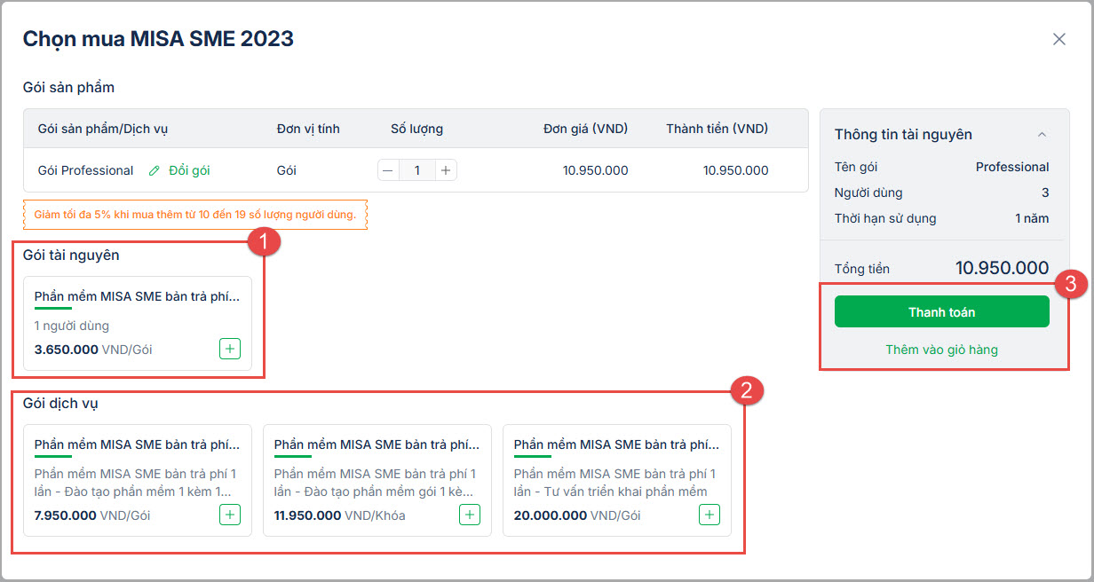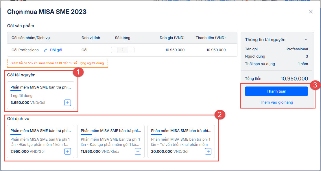 Tại màn hình Chọn mua MISA SME 2023, chọn số năm cần mua, mua thêm người dùng (ở mục Gói tài nguyên), gói đào tạo (ở mục Gói dịch vụ) (nếu cần) và nhấn nút: