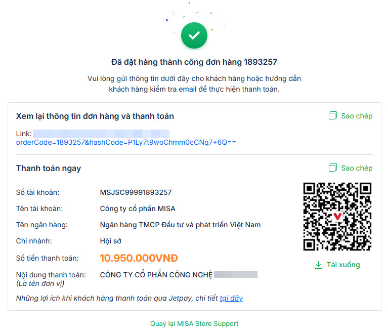 • Đặt hàng thành công và hướng dẫn thanh toán.