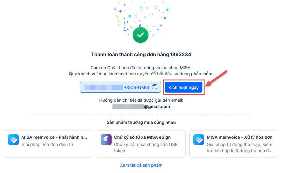 • Sau khi thanh toán thành công, Khách hàng nhấn Kích hoạt ngay hoặc làm theo hướng dẫn được gửi qua email.