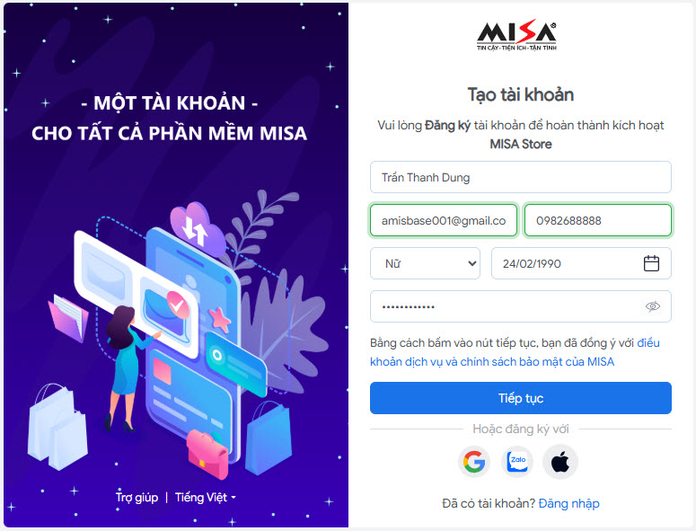 • Hệ thống sẽ hiển thị màn hình đăng ký tạo tài khoản MISA ID.